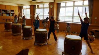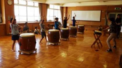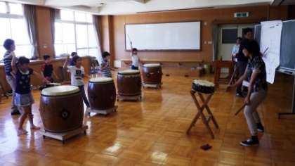 先生の太鼓にあわせて,しっかりと太鼓をたたいています。