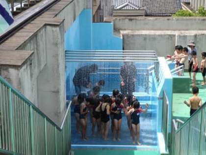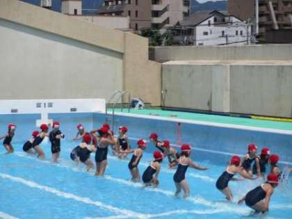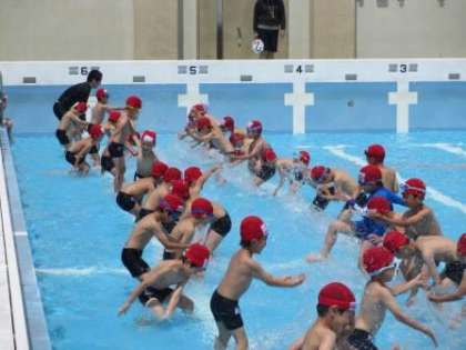 1・2時間目,初めてプールに入りました。着替え方,並び方など,たくさん覚えた後,いよいよ水の中へ入りました。元気に水の掛け合いっこなどをしました。