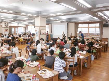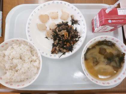 今日は,牛肉とひじきの炒め煮の人参が花型に,かみなりこんにゃくがハート型になったものが入っていて,子どもたちも見つけて喜んで食べていました。