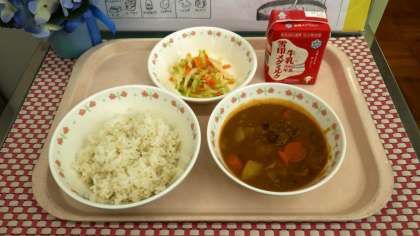 給食のカレーは,小麦粉やカレー粉をていねいにいためて,ルーを作っています。カレー粉は,いろいろなスパイスから作られています。手作りのルーを味わって食べましょう。