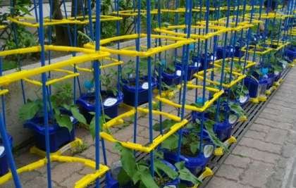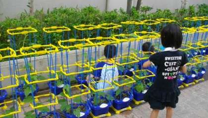 1年生が,あさがおに水をやっています。ずいぶん大きくなりました。