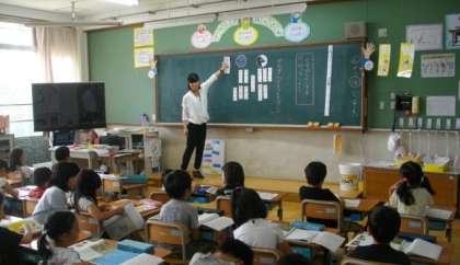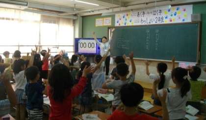 2年生は朝の会で,元気よく挨拶をしています。1年生は,国語の学習をしています。
