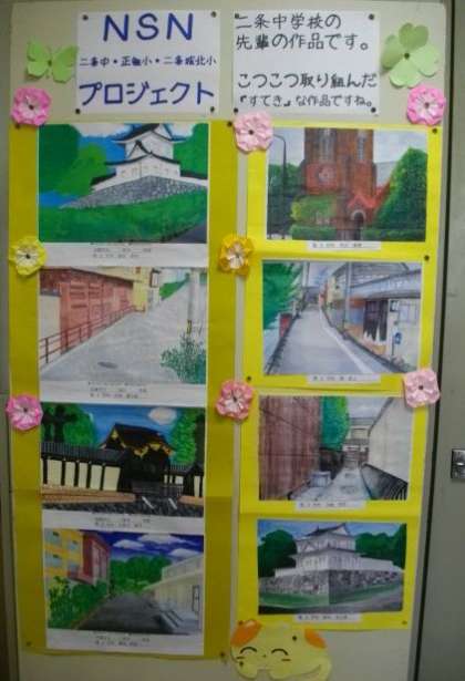 二条中学校・正親小学校・二条城北小学校の3校が,小中を通して子どもたちの学びや育ちを見守っていくために,NSN(二条中・正親小・二条城北小)プロジェクトでいろいろな取組を進めています。すでに,生徒会・児童会が協力して,挨拶運動やペットボトルキャップの回収,キャラクター募集等の取組を進めています。ほかにも,二条中学校の先輩が様々な分野でがんばっている様子を,作品や写真等で紹介していきたいと考えています。今月は,美術作品をお借りして,校内に掲示しています。