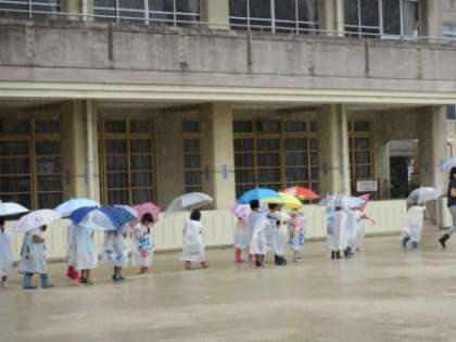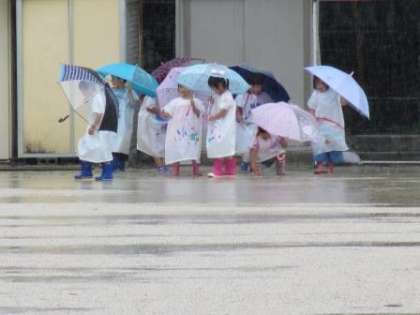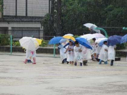 休日参観日に作ったレインコートを着て,雨の日の「すてき」を見つけに運動場へ出かけました。