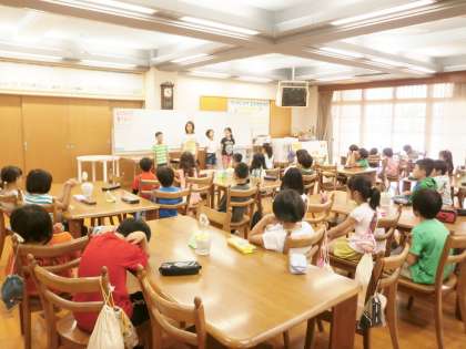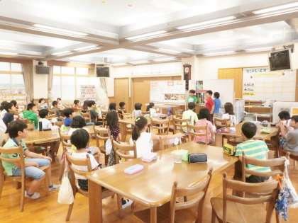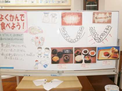 4年2組が,給食前にランチルームで食の学習を行いました。テーマは「よくかんでたべよう」です。