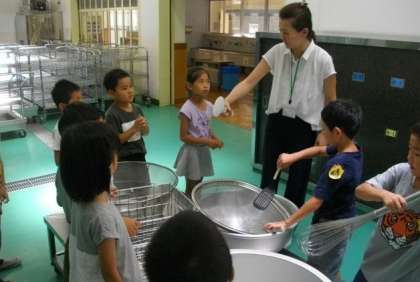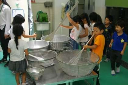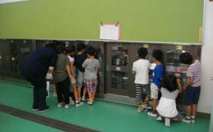 今日は,給食室の様子を見にいきました。たくさんの驚きと発見があったようで,「わー,おおきなおなべがある」「こんなおおきいおしゃもじ,はじめてみた」「びっくりしたー」「すごーい」「先生,おなかがへってきた・・・」といろいろな声を聞くことができました。