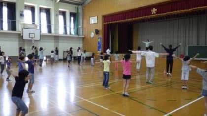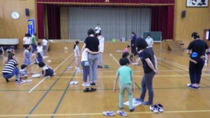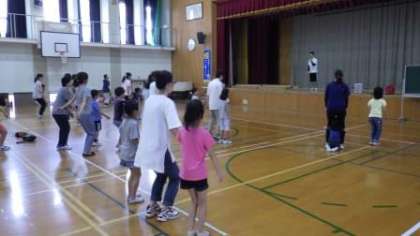 PTAの皆さんが,親子スポーツ教室を開催されています。簡単なゲームの後,ラジオ体操第一・第二を教えていただきました。