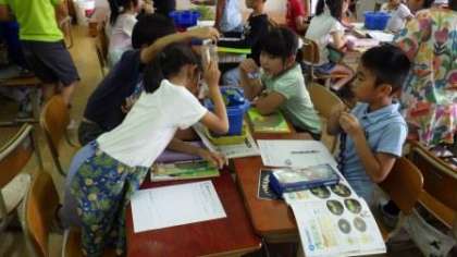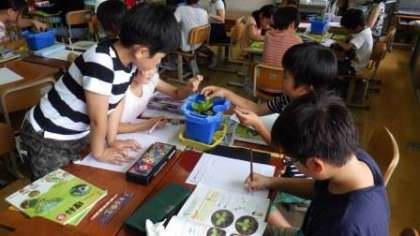 わかたけ学級は,算数の学習をしています。3年生は,理科の学習で自分たちが育てている植物の観察をしています。
