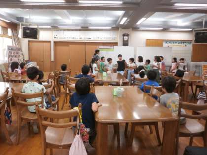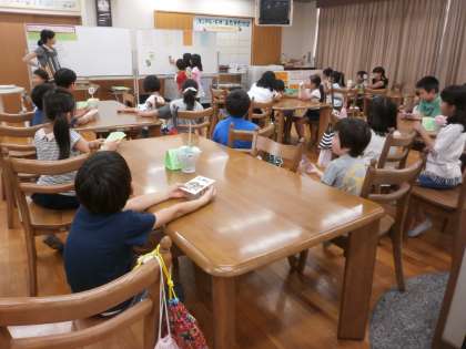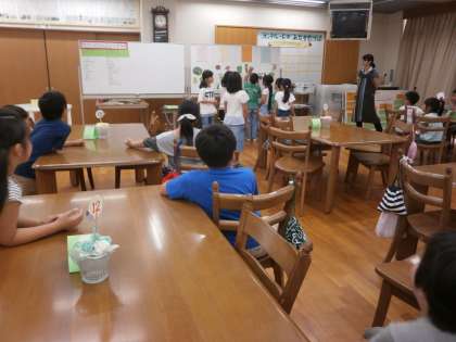 2年1組が給食前にランチルームで食の学習を行いました。テーマは「やさいとなかよくなろう」です。