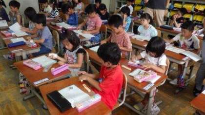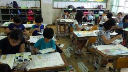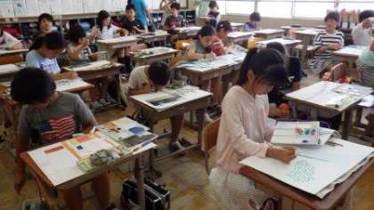 1年生は,数図ブロックを使って算数の学習をしています。5年生は,図画工作で風景画を描いています。