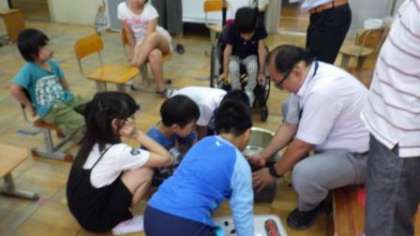 わかたけ学級で飼育しているカブトムシの脱皮した抜け殻を見つけたので,飼育箱をそっとさわってみました。成虫になっているカブトムシを見つけて,みんなで喜びました。