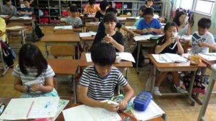 6年生は図工の学習で平和ポスターを描いています。4年生は算数「垂直・平行と四角形」の学習をしています。