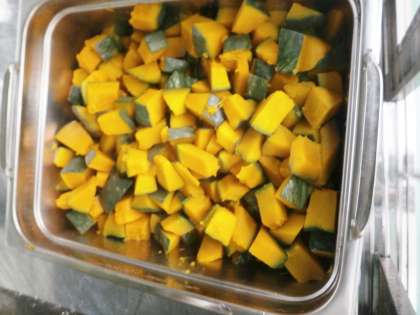 かぼちゃの煮つけは,スチームコンベクションオーブンを使用してかぼちゃを三温糖・みりん・しょうゆで煮つけました。煮崩れが少なく,甘く美味しく仕上がりました。