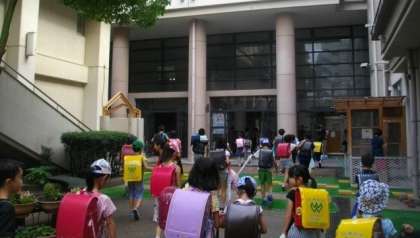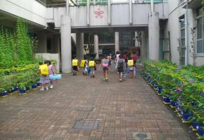 雨あがりで,少し蒸し暑い天気になりました。子どもたちが登校してきました。今日はせみの声が響いています。
