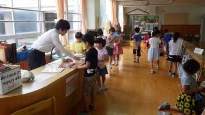 今日は学校司書の先生が来ておられます。絵本や図鑑などいろいろな本を借りています。
