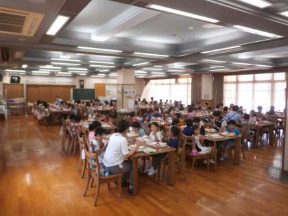 1年2組が給食前にランチルームで食の学習を行いました。テーマは「ランチルームってどんなところ」です。