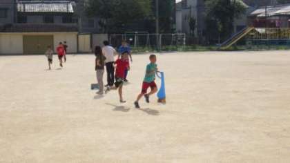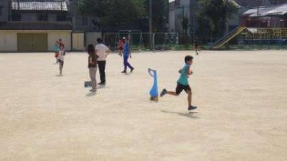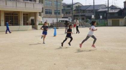 6年生が朝マラソンをしています。ストレッチや5分間走などをがんばっています。