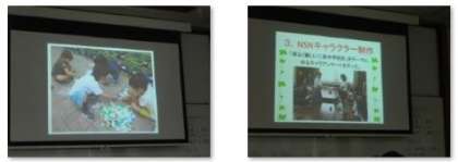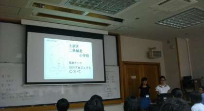 本校が選んだ発表テーマは「小中連携」で,二条中学校区にある二条中学校・正親小学校・二条城北小学校の3つの学校でNSNプロジェクトとして取組を進めており,写真を交えながら,あいさつ運動やエコキャップ集め,キャラクター制作について発表しました。