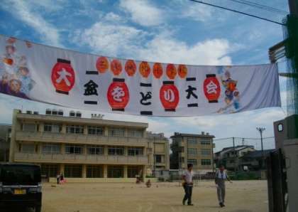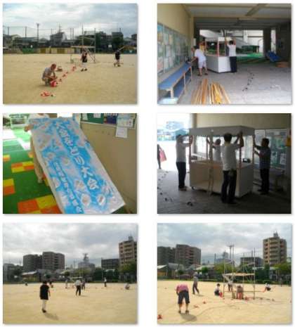 朝に雨が降っていましたが,9時には青空がひろがっています。地域の方々が集まって,提灯や看板の設置を進めておられます。