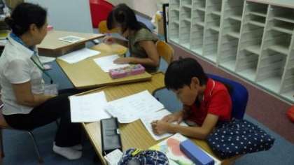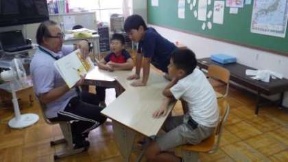国語の学習をしています。ワークシートをしたり,読み聞かせを聞いたりしています。