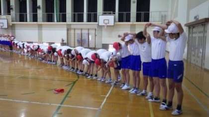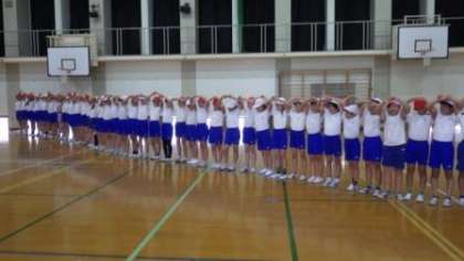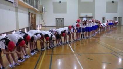 集団演技の練習をしています。今日は並び方を確認したり,音楽に合わせてウェーブの練習をしたりしています。