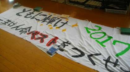 先日の朝会で,児童会から今年の運動会のスローガンについて発表があり,放課後に横断幕を作成していました。