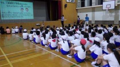今日の朝の時間は,5年生とわかたけ学級が合同運動会に向けての話を聞きました。話の後は,合同運動会で歌う歌や準備運動の練習をしました。