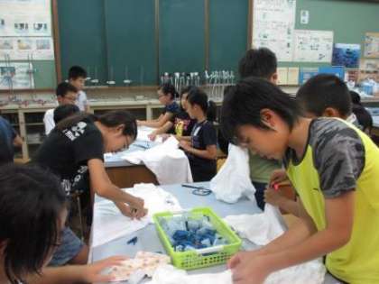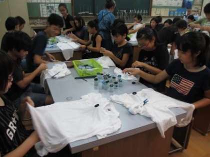 図画工作科の学習で藍染の体験をしました。真っ白なTシャツにどんな模様をつけようかと考えて,制作を始めました。染上がりがどんな柄になるのかわくわくします。