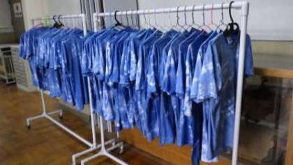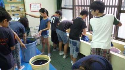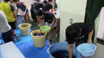 いよいよ藍染の液につけています。すてきな模様ができて,うれしそうです。