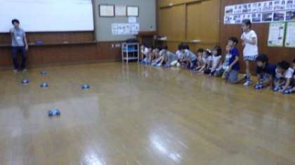 ゴムで動く車を使ってゲームをしています。気づいたことを話し合いました。