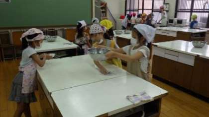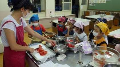 育てたトマトを使って,トマトピザの調理実習のためのトマトソース作りをしています。子どもたちはトマトの皮をむきました。片づけもみんなで協力してできました。