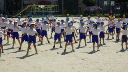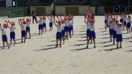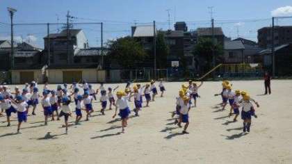 運動場で団体演技「よっちょれ」の練習をしました。楽しく踊っています。