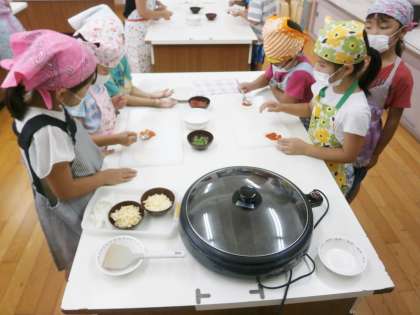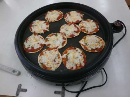 2年生が家庭科室でトマトピザ作りをしました。ぎょうざの皮に,昨日みんなで皮むきをして作ったトマトソースとピーマンとチーズをのせて焼きました。トマトソースが甘酸っぱくておいしいと喜んで食べていました。トマト苦手だったけれど好きになったという感想もありました。