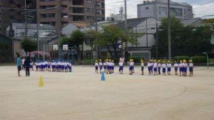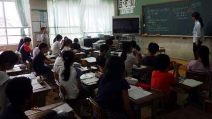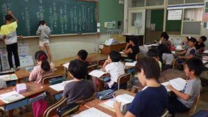 1年生は体育で運動会の団体競技の並び方を練習しています。4年生は国語で熟語について学習しています。5年生は理科で植物の受粉の実験について話し合っています。