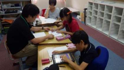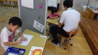 国語の学習をしています。1年生は絵本の読み聞かせや文字の学習をしています。3年生と5年生は,ワークシートやタブレットを使って筆順の学習をしています。