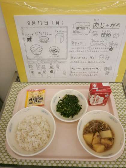 「肉じゃががおいしかったです。味付けがまろやかで,甘くもなく辛くもなくおいしかったです。給食カレンダーをみて,いろいろな肉じゃがの味を食べ比べてみたいと思いました。」(6年児童)