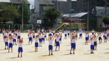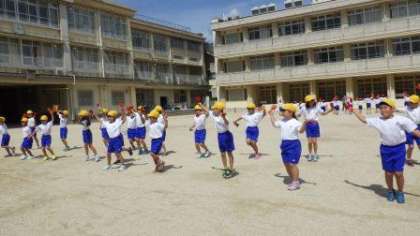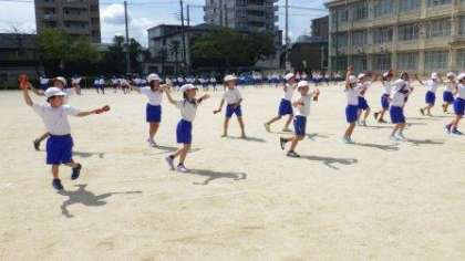 団体演技「よっちょれ」の練習をしています。曲の間奏での列の移動も上手になっています。