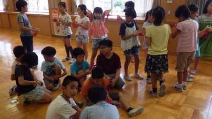団体競技「台風の目」の入場でダンスをする時の飾りをつくっています。