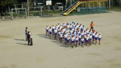 団体演技の練習をしています。音楽に合わせて行進しながら,隊形移動する練習をしています。