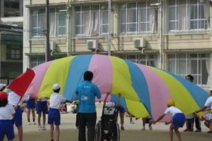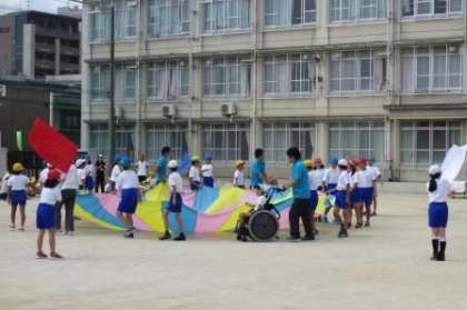 わかたけ学級の表現種目です。わかたけ学級と応援団児童がバルーンで運動会を盛り上げます。全校のみんなも応援席で一緒に声を出します。