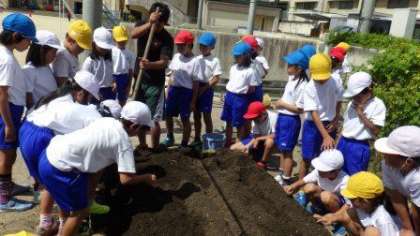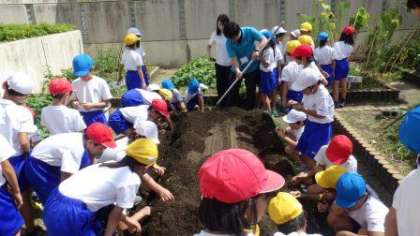 今日は九条ねぎの苗を植えます。教えていただきながら,みんなで協力して草ひきをしたり,うねをつくったりしています。