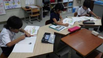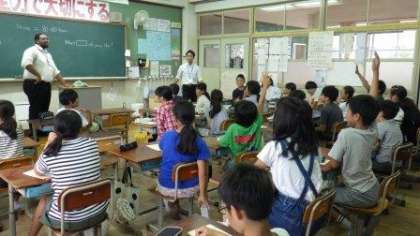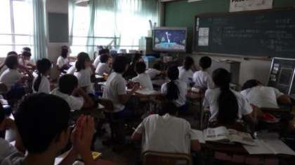 2年草の芽学級は算数の学習をしています。5年生は外国語活動で新しいALTの先生に質問をしています。6年生は社会科でデジタル教材を使って歴史の学習をしています。