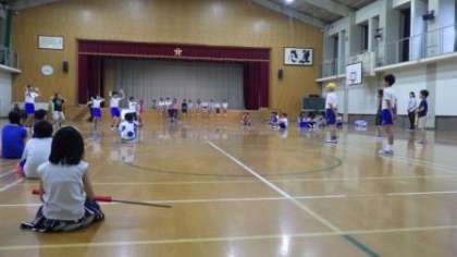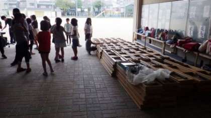 今日の6時間目は,高学年児童が運動会前日準備を予定していましたが,雨のため,準備内容を少し変更して活動しました。長いすを運んだり,全校体操や応援の練習などをしたりしました。