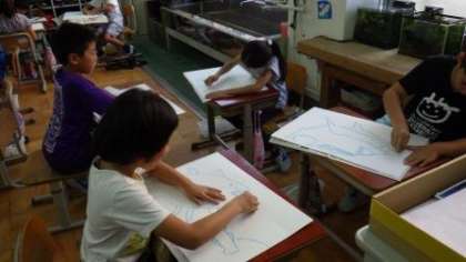 パスで下絵をかいたり,絵の具で色をぬったりしています。