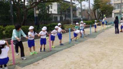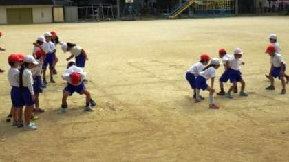 今日はクラスごとに体育の学習をしています。2年1組は「すもうあそび」をしています。2年2組は「てつぼうあそび」をしています。2年3組は「まねっこあそび」をしています。