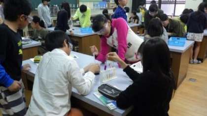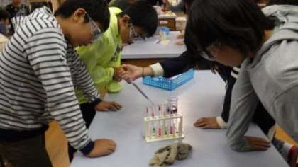 ムラサキキャベツを使って,酸性・中性・アルカリ性を調べています。