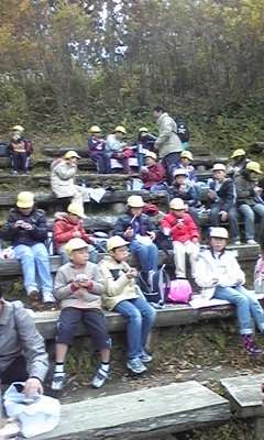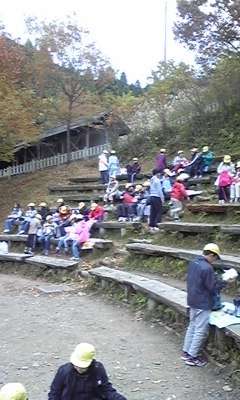 昼食の時間です。子どもたちは,家から持ってきたお弁当をおいしそうに食べています。自然の中で食べるお弁当は,気持ちよくて,いつも以上においしく感じているようです。