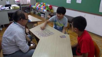 4年生と6年生は,カードを使った活動を楽しんでいます。3年生と5年生は国語の学習をしています。漢字カードを使ったり,タブレットで音読の学習をしたりしています。