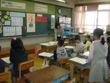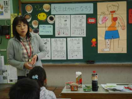 1校時3−2・2校時3−1で「大豆はかせになろう」というテーマで泉原栄養教諭が授業を行いました。