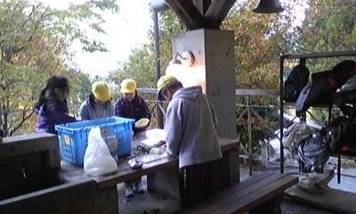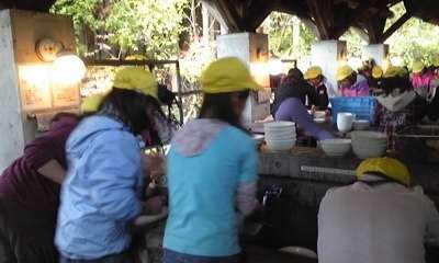 野外炊事です。かまどに火をつけたり,野菜を切ったり,調理をしたり,と大忙しでした。でも,頑張ったかいがあって,とても美味しい豚汁ができあがりました。